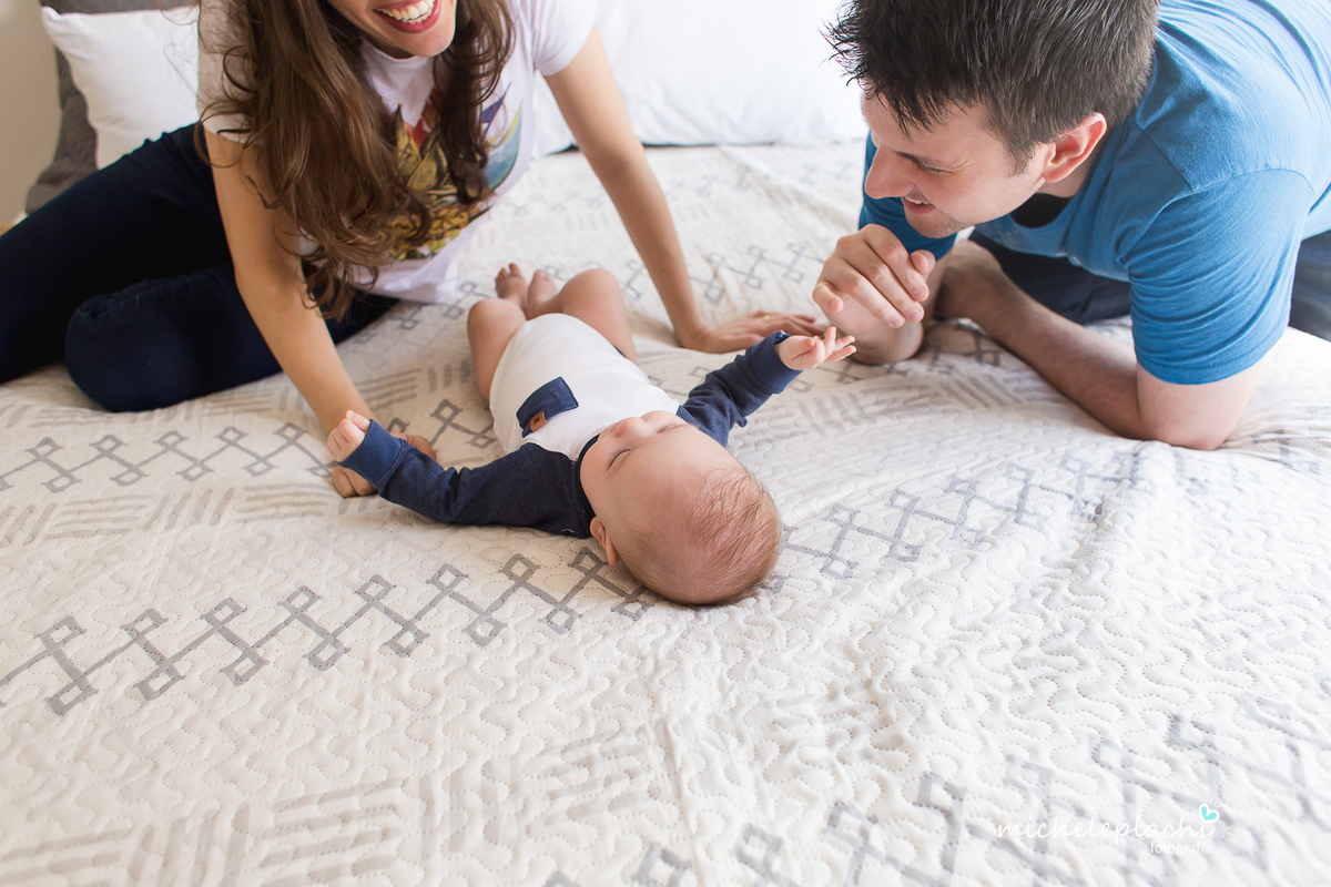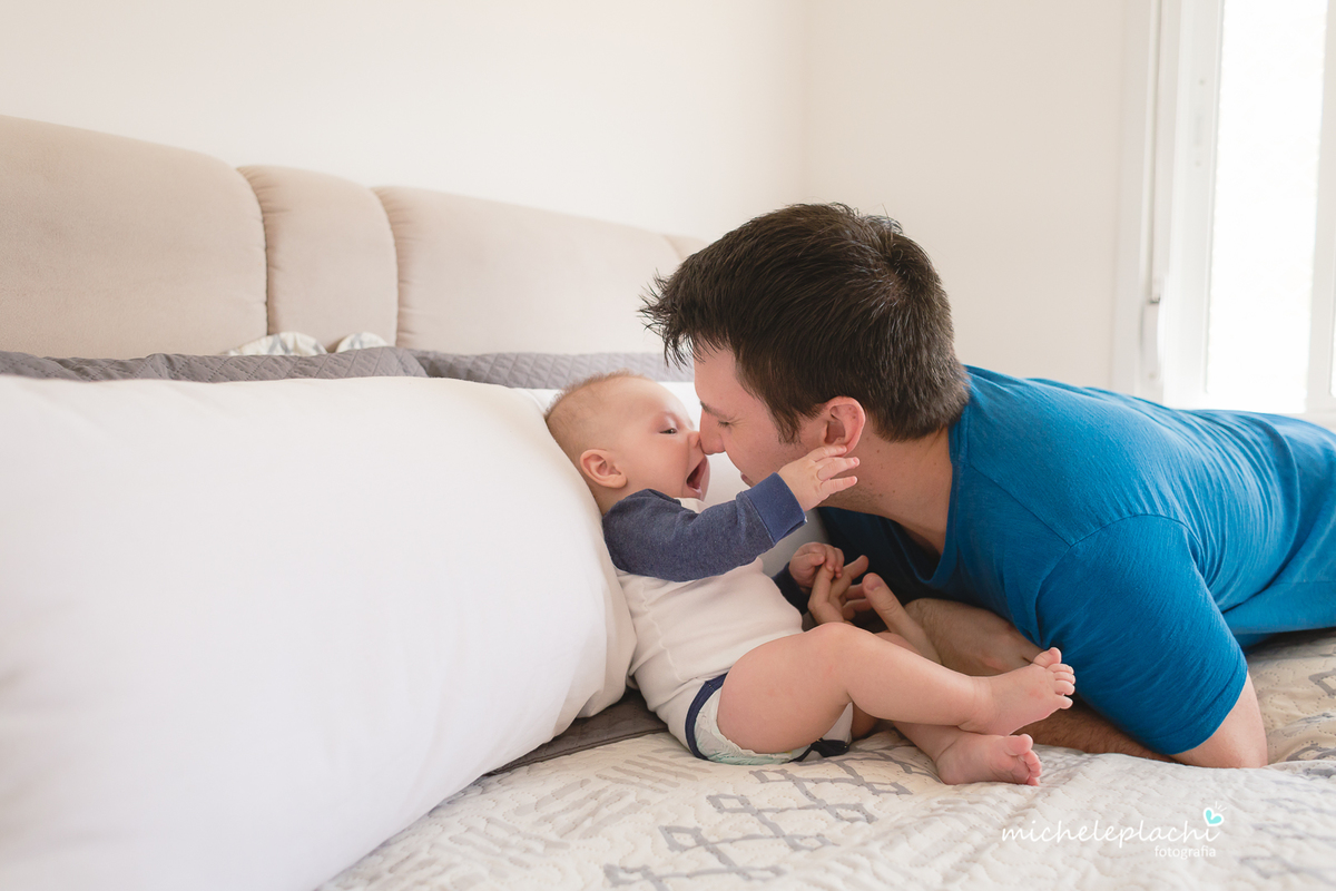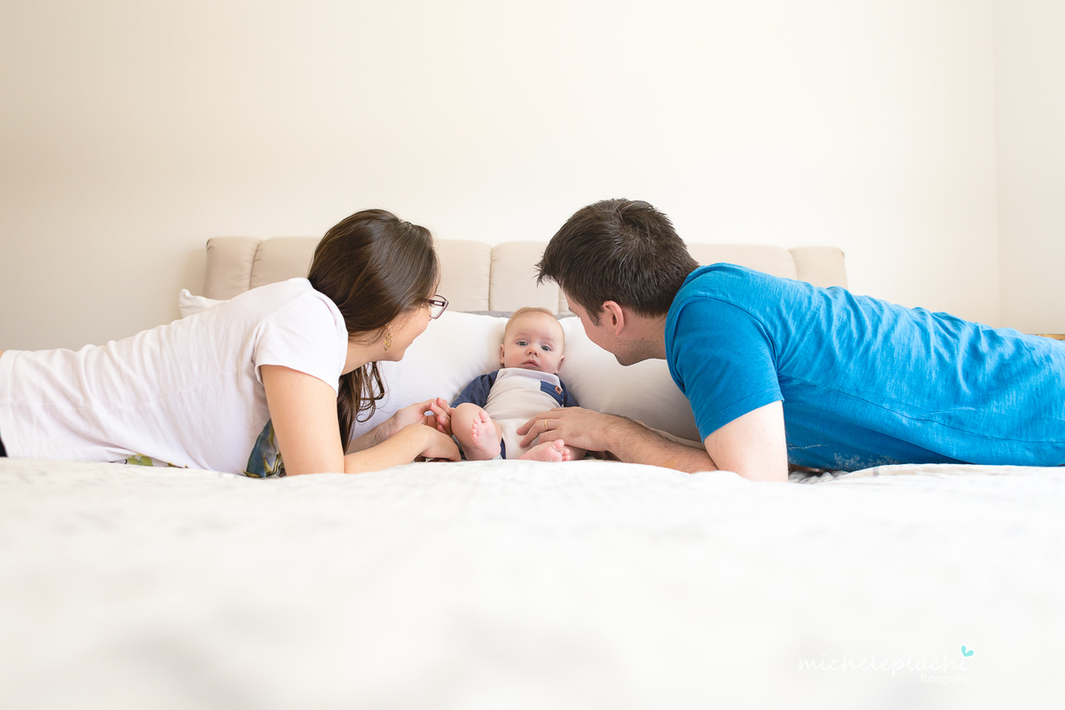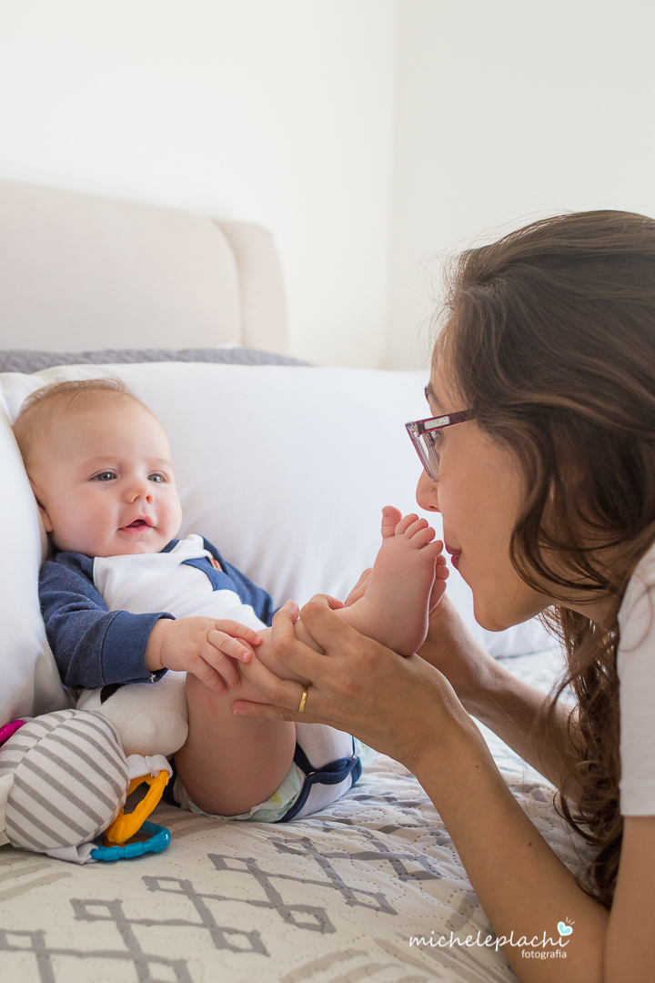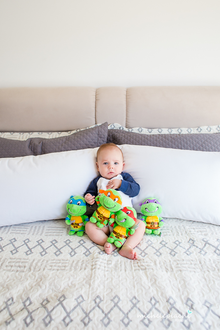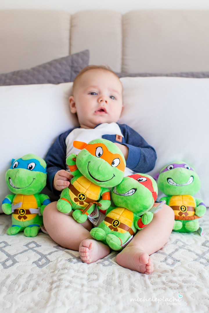 Nesta sessão notamos que ele segue um grude com a mamãe, já se diverte com o papai e adora seus amigos "As Tartarugas".